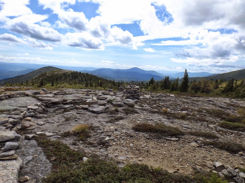 A weird summit cairn. The Doubleheads are to the right and the Moat Mountains dead center.
