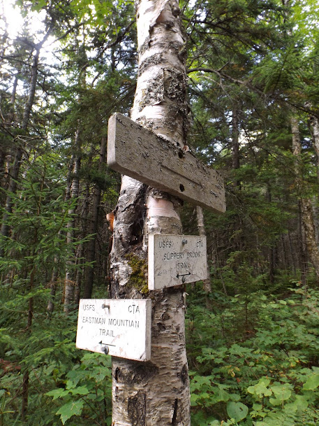 Finally we make it to the junction with the Slippery Brook, Eastman Mountain and Baldface Knob Trails and rest a second before we head over to Eastman Mountain.